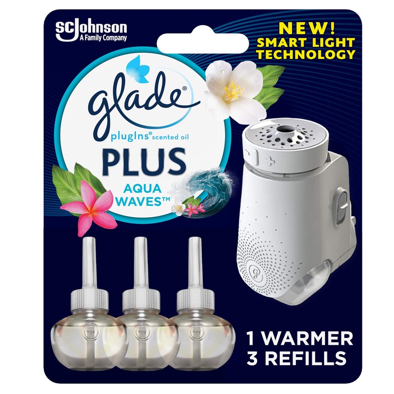Glade PlugIn Plus Air Freshener Starter Kit, Scented Oil for Home and Bathroom, Aqua Waves, 2.01 Fl Oz, 1 Warmer + 3 Refills