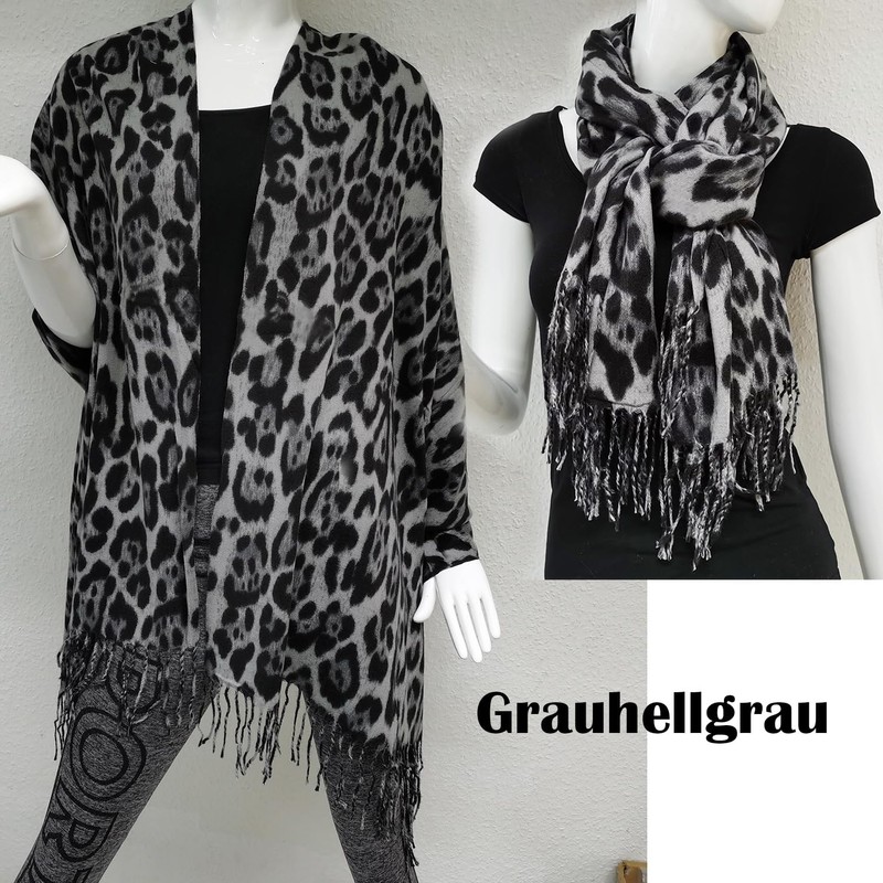 Glamexx24 Women's XXL Scarf Cuddly Warm Leopard Pattern 3 Coloured Fringe Poncho Scarf Oversized Blanket Scarf, Grey, light grey