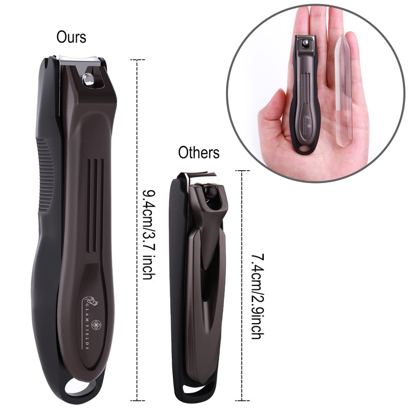 GLAMFIELDS - Cortaúñas grande con recogedor, antisalpicaduras, acero inoxidable, desmontable, fácil de limpiar, para hombres y mujeres mayores (L+Nano lima de vidrio)