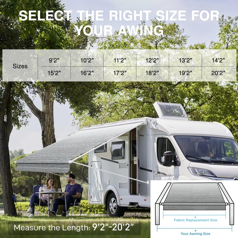 • [Sizing Guide] Our replacement fabric for rv awnings are available in sizes 9'2"C20'2" to fit most RVs. Please be sure to measure measure the distance between the center of the Awning arms from left to right to choose the right size. Eg.If your tralier Awning size is 16', then choose the 16FT(fabric 15'12")for your Awning for camper.
