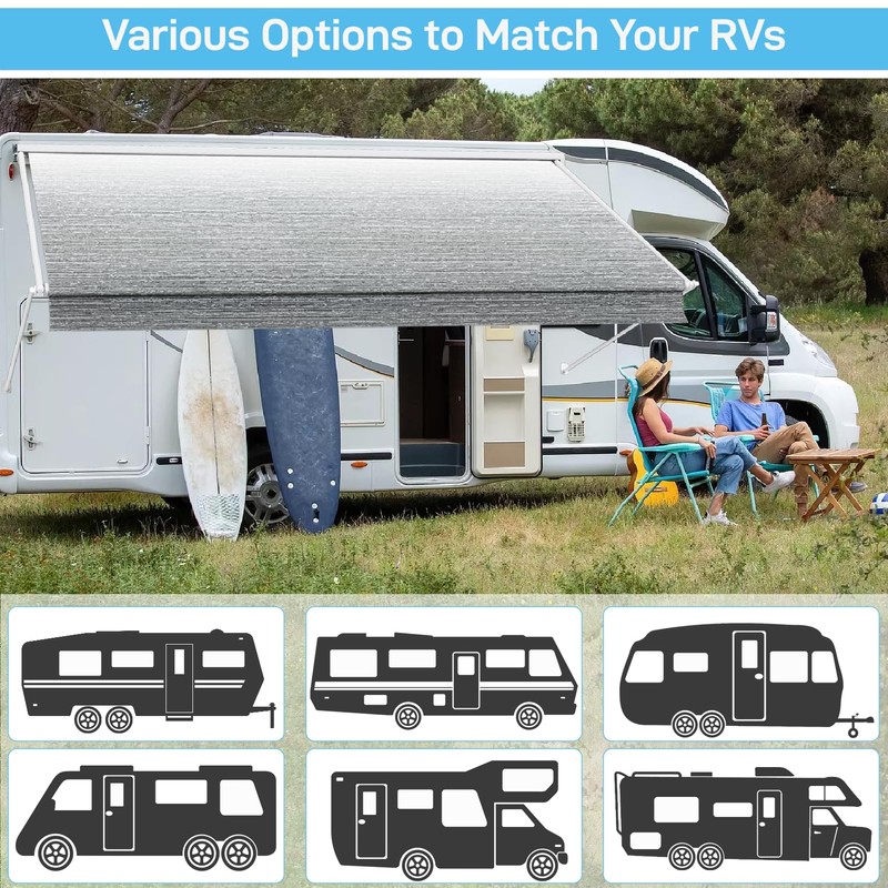 - [Sizing Guide] Our replacement fabric for rv awnings are available in sizes 9'2"–20'2" to fit most RVs. Please be sure to measure measure the distance between the center of the Awning arms from left to right to choose the right size. Eg.If your tralier Awning size is 16', then choose the 16FT(fabric 15'5")for your Awning for camper.