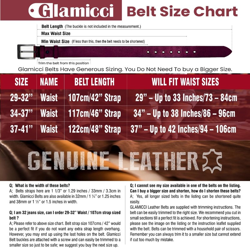 - ✅ GLAMICCI Leather Belts are supplied with trimming instructions. The belt can be easily trimmed to the right size. We recommend you buy a larger size, cut in small sections till a perfect fit is achieved, you can always cut off more. For shortening instructions, please see the image on the listing or the instruction leaflet. Belts can be trimmed with a household pair of scissors.