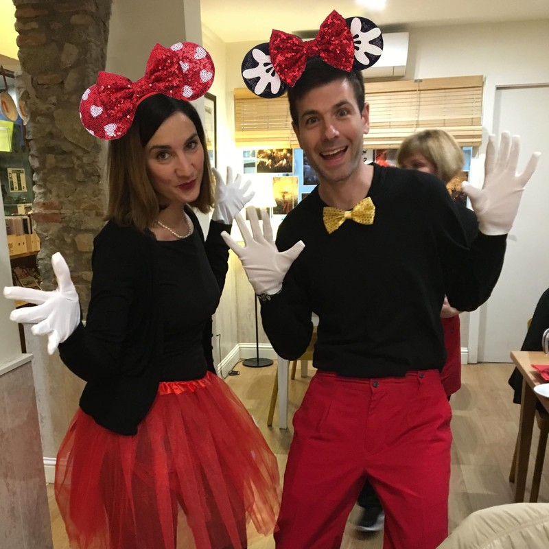 - This Minnie Mouse costume set includes 1 black and red heart mouse ears headband and 2 pairs of white gloves. Everything you need for a magical fancy dress appearance.