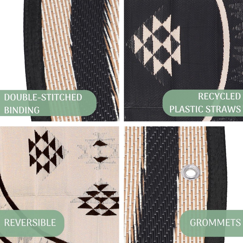 - Eco-Conscious Recycled Rug - Unlike cheap plastic rugs that easily rip and snag, this outdoor area rug is crafted from high-quality recycled plastic straws 100% polypropylene, making camper rug more durable. A recycled outdoor round rug is good for the environment, and you'll reduce waste and the expense of buying a new balcony rug each year.