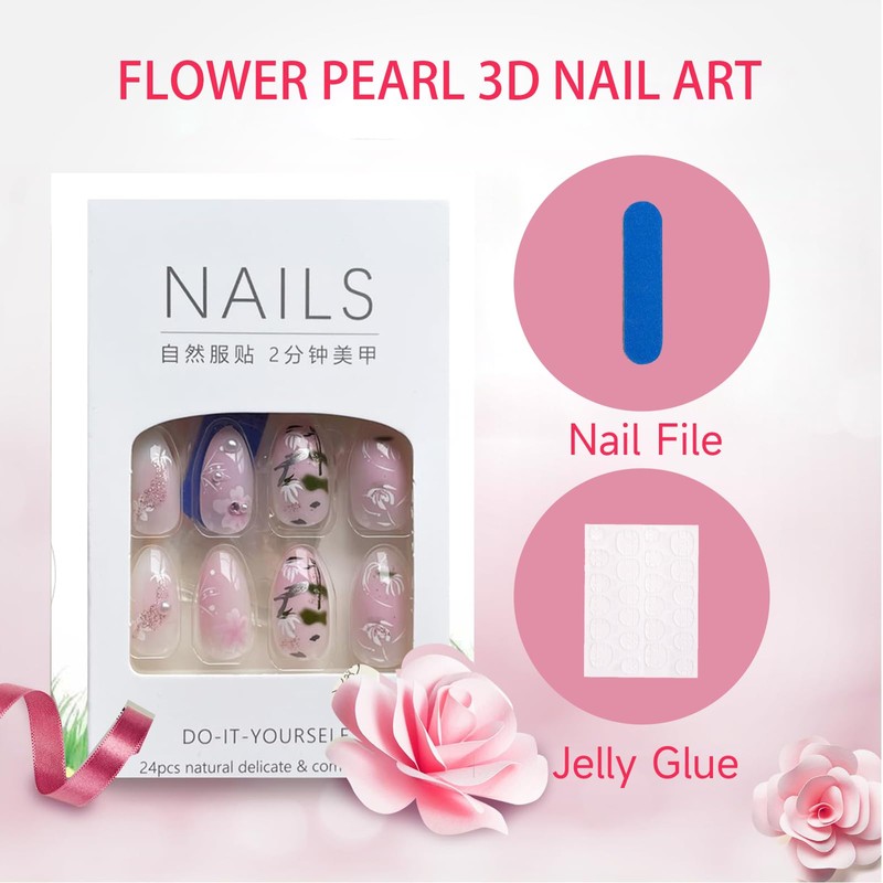 - Product content: One box includes 24 pieces of 3D-relief flower false nails, a nail file, and 24 jelly adhesives. The false nails are available in 12 different sizes, making it easy for you to select the right fit for your nails