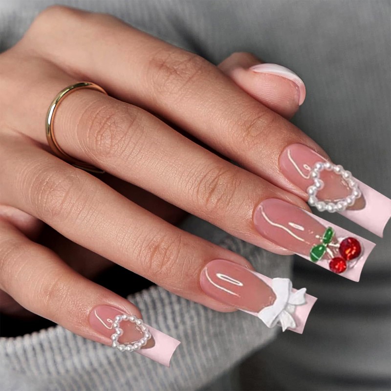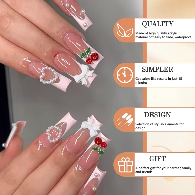 GlamRays 3D Cherry Bow Pearls False Nails White French Tips Press On Nails Extra Long Square False Nails with Design Shiny Cover Artificial Nails