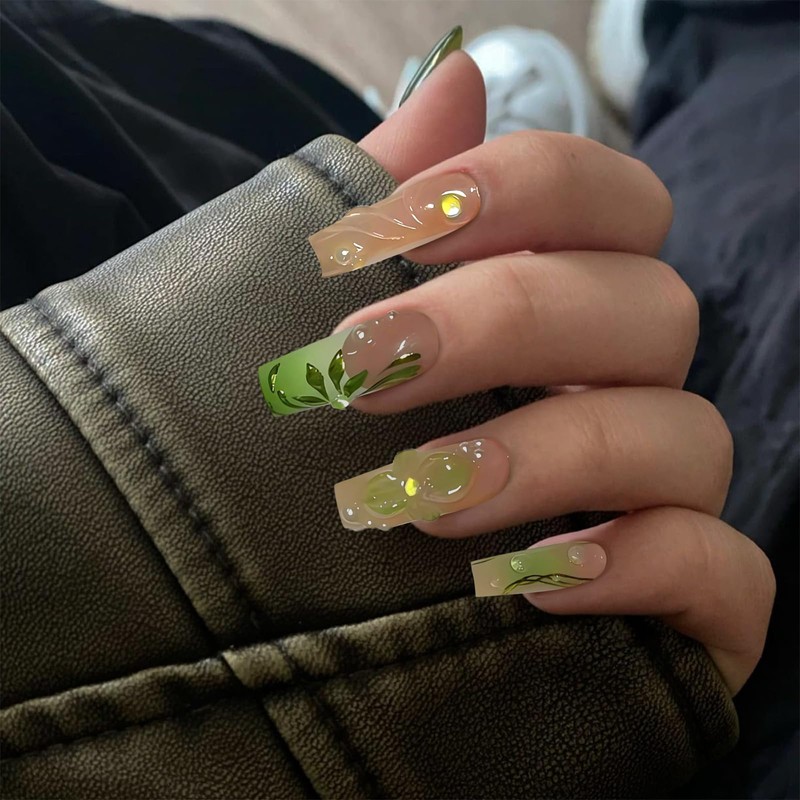 GlamRays Press on Nails Long Square False Nails Green French Tip Glue Nails 3D Water Wave Design Acrylic Nails Pack of 24 Handmade False Nails Squoval Manicure Artificial