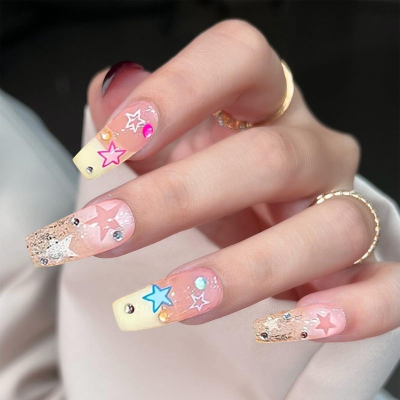 GlamRays Press on Nails Medium Square Shiny Full Perimeter Acrylic French False Nails with Star Design Artificial Medium False Nails with Charms Pack of 24
