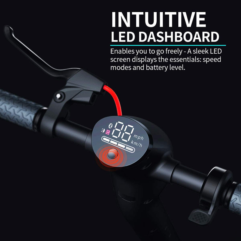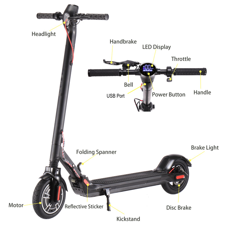 Max speed: 15 MPH Range:12-18Miles Motor:350W Battery:36V 7.5A Max Load: 220lb Charging Time: 4H Wheels : Versatile and comfort by featuring 8.5 inch solid tires that easily ride over bumps and cracks in your city streets and sidewalks. Hight-powered 350W BLDC Hub motor offers hill climbing torque and improves performance in all demanding driving conditions. LED headlight and tail light: Ride at night! The S10 is equipped with an ultra bright LED headlight and tail light, also ultra bright side light, drive safe any time. Front and rear independent suspension system offers riding comfort Foldable: Unique patented folding system makes it easy to go with you where ever you go. More safe: double Breaking System, Front: electronic EBS brake, Rear Build-in 120mm wider rear disc-brake. APP can check scooter on your phone anytime monitor battery and speed, range.