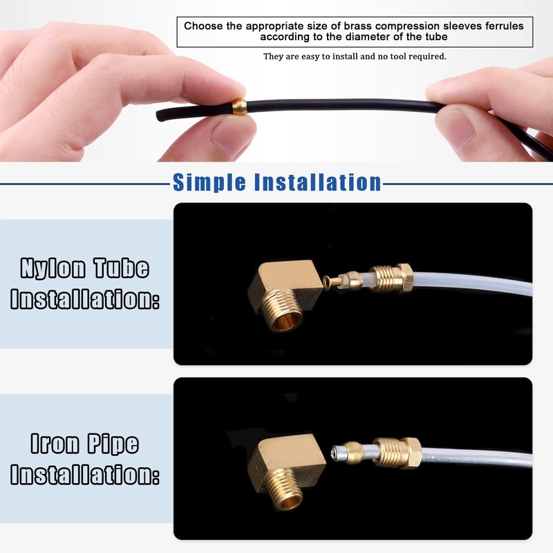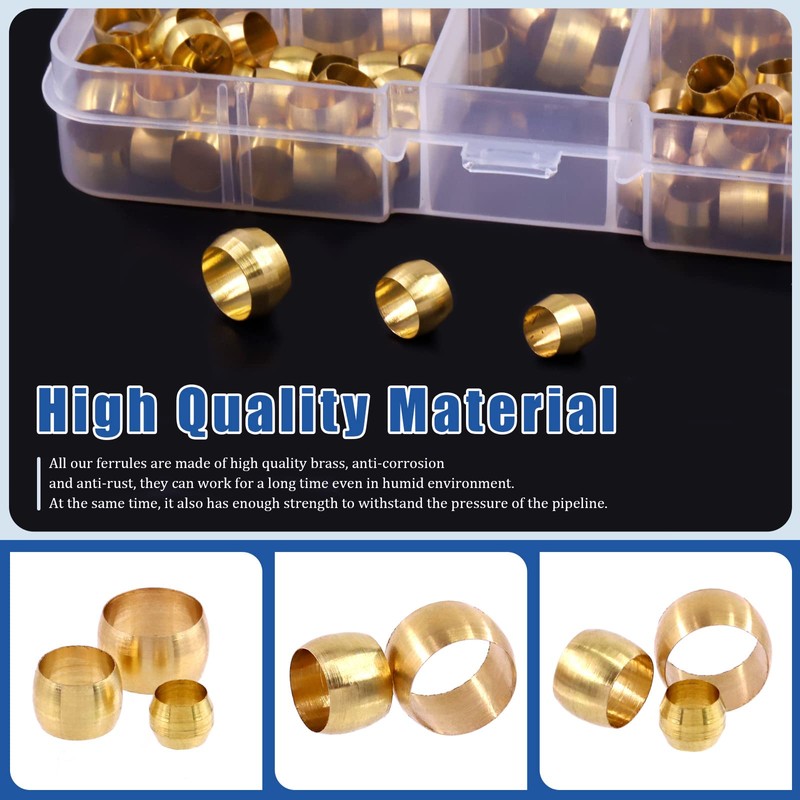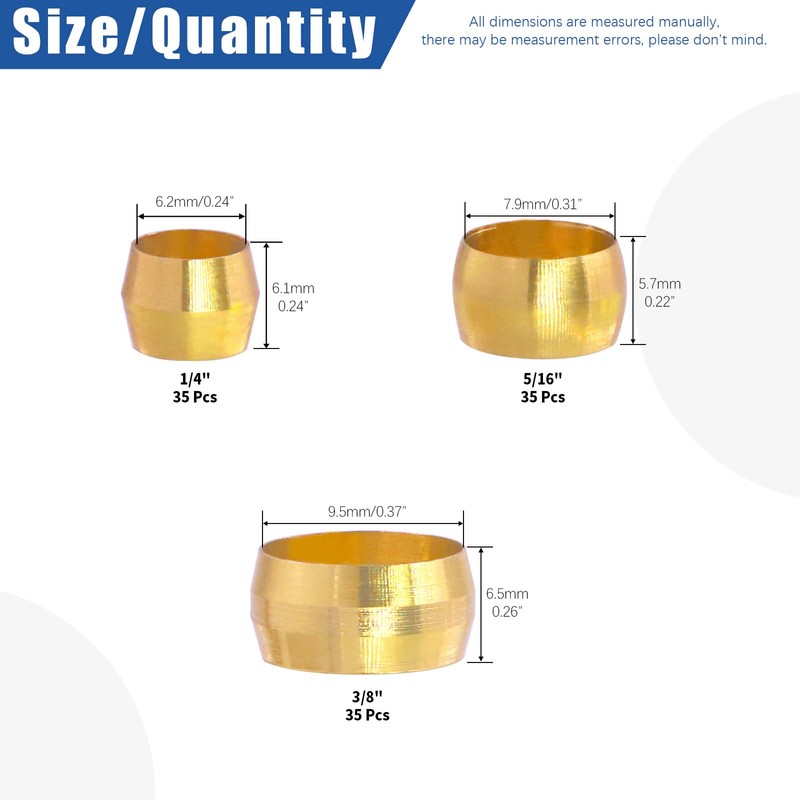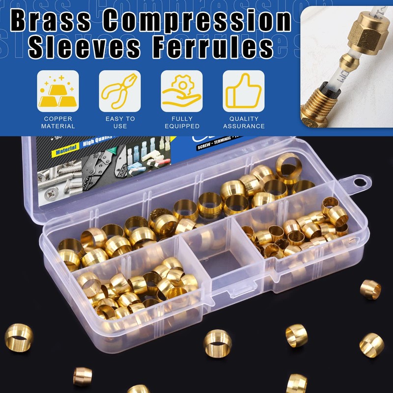 Glarks 105pcs 3 Sizes Brass Compression Sleeves Ferrules, Brass Compression Fitting Assortment Kit(3/8" and 1/4" and 5/16")