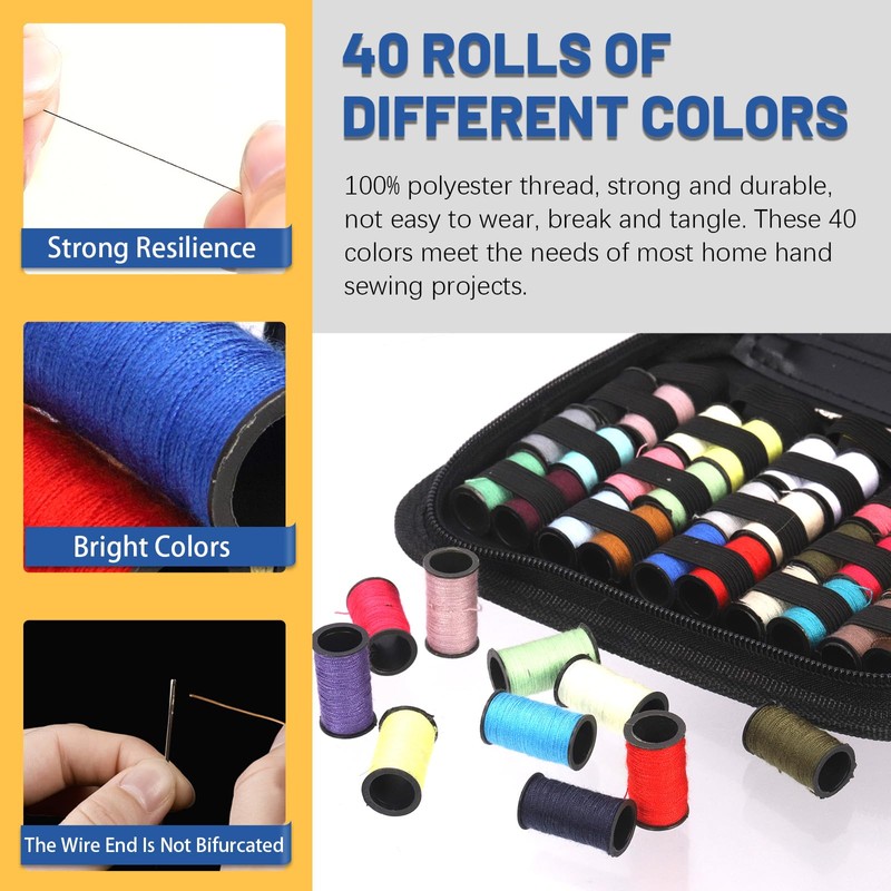 - ♛【Multi-Color Spools】: Sewing kit contains 40 bright colors of thread spools, which can match most of fabric colors. Made of 100% polyester, these threads featured with high resilience, not easy to wear, break and tangle, the wire end is not bifurcated. And our large sewing kit includes various basic tools for conveniently used with these colorful thread spools.
