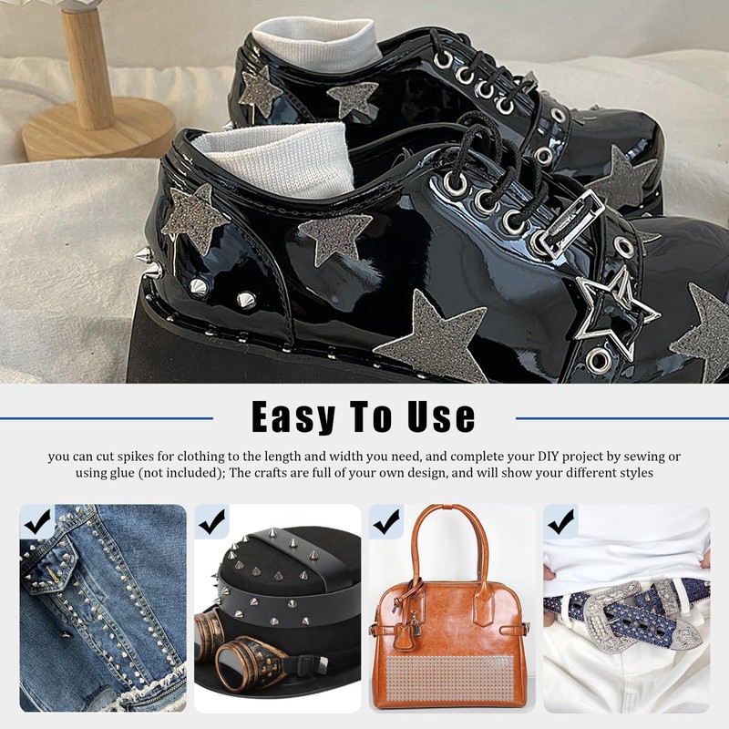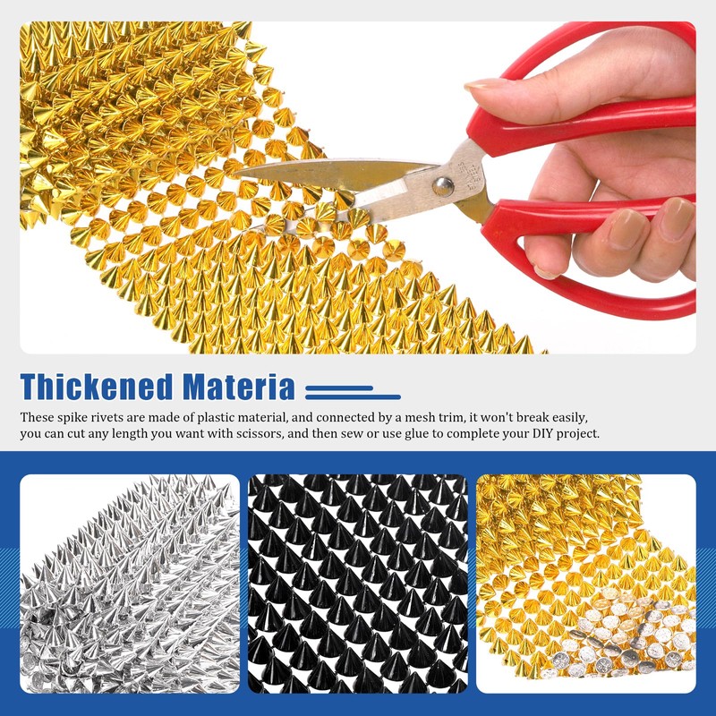 - đ ăEasy to useă: These mesh spike rivets are connected by a mesh trim that not easy to break. You can cut them to the length and widths you want with scissors, and then glue them onto your personal items. You can also sew them onto leather or fabric to decorate your clothing and complete DIY projects.