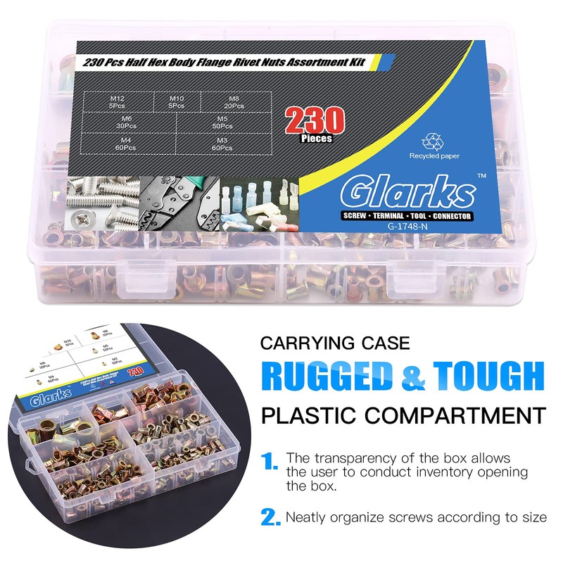 Glarks 230Pcs M3 M4 M5 M6 M8 M10 M12 Half Hex Body Flange Rivet Nuts Assortment Kit, Zinc Plated Carbon Steel Flat Head Threaded Insert Nut Rivnut Set (Rivet Nut Set)