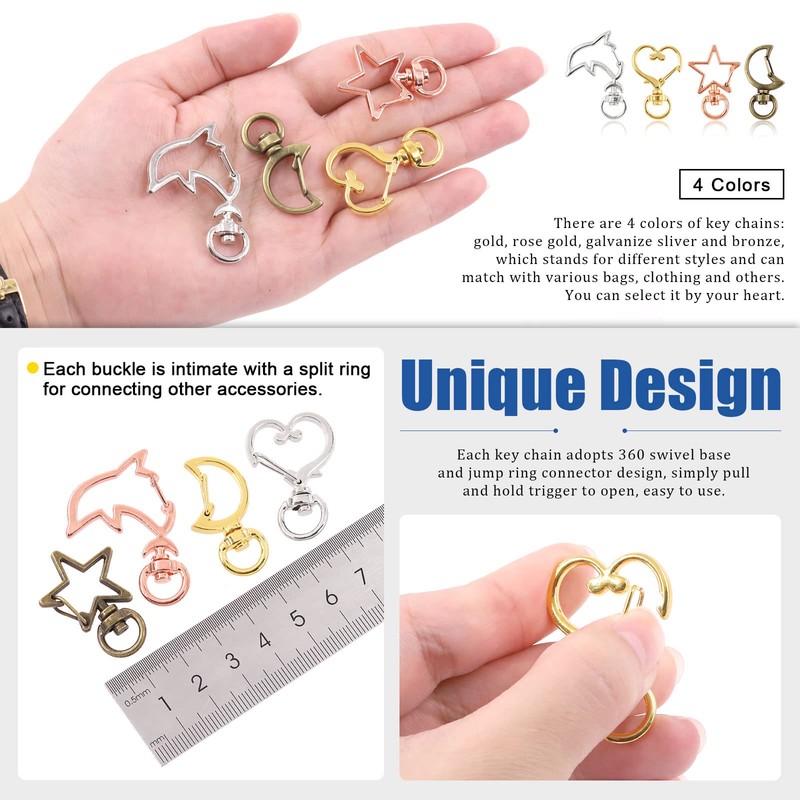 - ➤ [Package Includes]: You'll receive 32pcs different shape claps including 8pcs heart shaped clasps, 8pcs star shaped clasps, 8pcs moon shaped clasps and 8pcs dolphin shaped clasps. Different shapes can help you DIY various styles of key chains or other crafts.