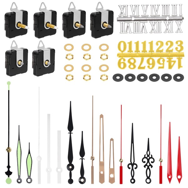 - ♛【Package Includes】: Our clock mechanism kit contains 6pcs clock movements with 6pcs hooks, 6 different pairs of clock hands, 6pcs rubber gaskets, 6pcs washers, 6pcs hex nuts, 1pcs gold Arabic numeral and 1pcs silver Roman numeral. Totally for 38pcs. This quartz clock replacement movement parts comes with mounting hardware suitable for repairing, replacing or building clocks.