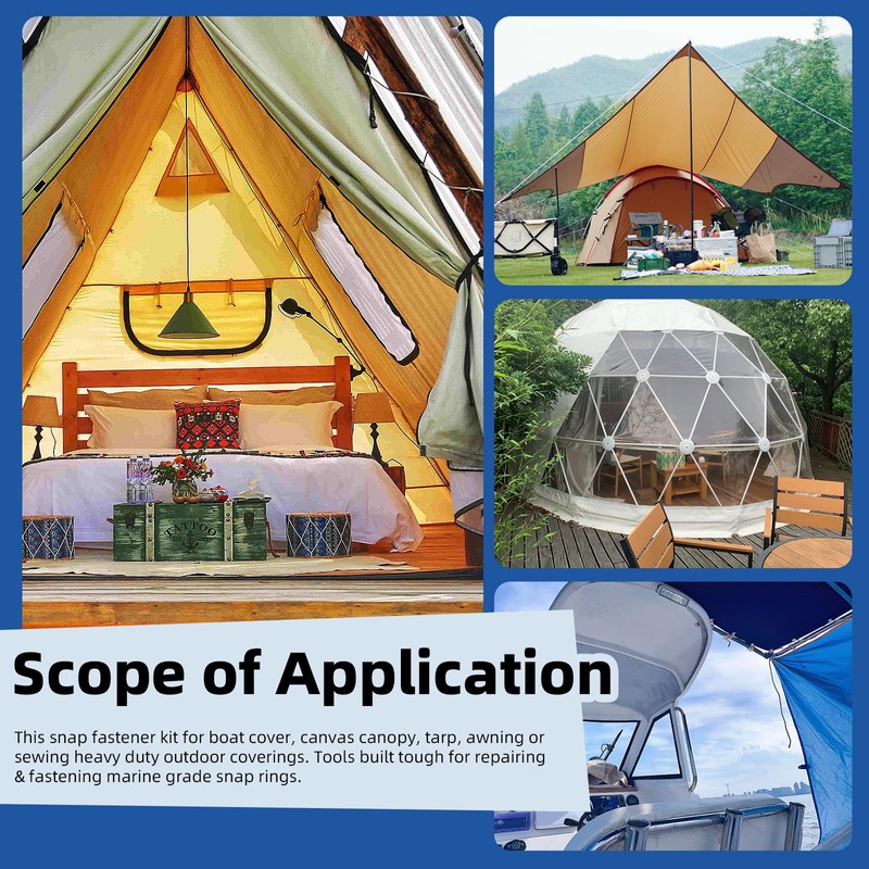 - ♛【Wide Applications】: Canvas snap button kit are widely used for various applications such as boat canvas, straps, boat enclosures, boat seat covers replacement, tarpaulins, tents, awnings, sailcloth, boat upholstery, carpet snaps, lawn furniture, and many more materials. They are strong and great for both indoor and outdoor use.
