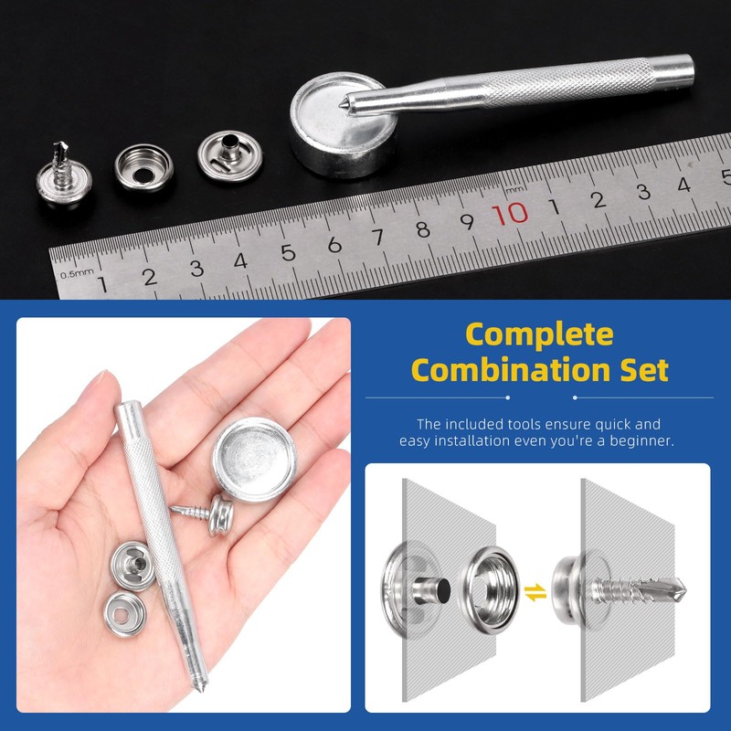 - ♛【Very Practical】: The snap button fastener kit is very handy and so easy to use, which also includes 2pcs setting tool to cut clean holes into the material that will speed up the installation process while keeping the material tidy and neat. You just screw in the screws, connect the cover clip, and then snap it on, canvas snaps tool makes our installation and removal easy.