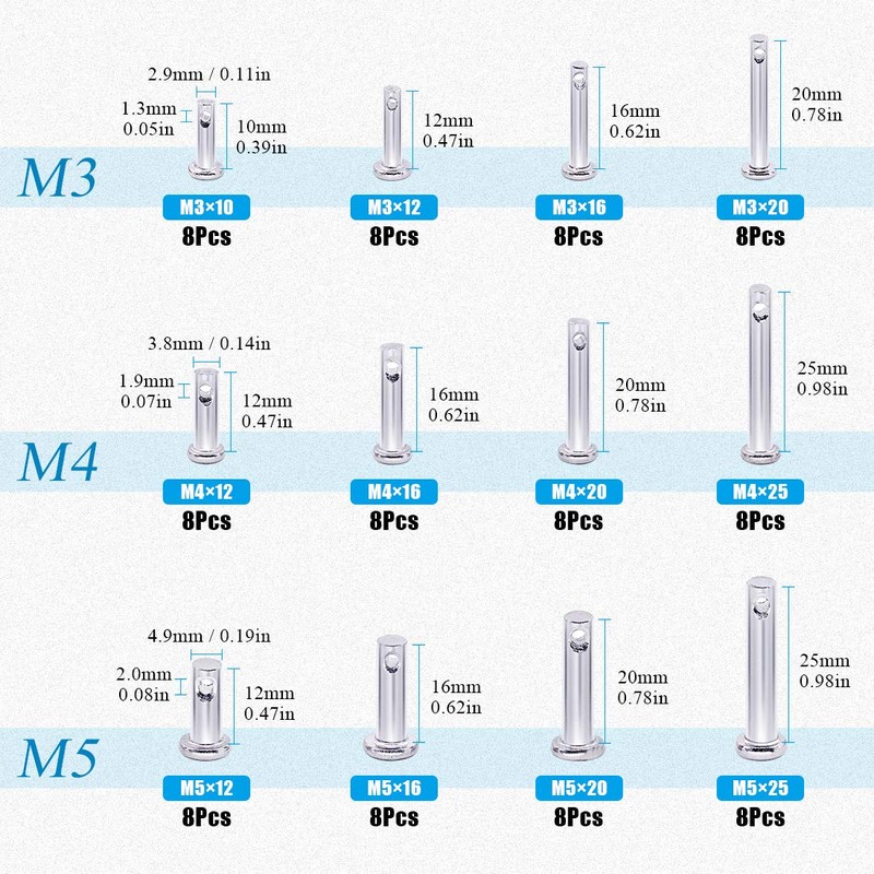 - ❋ [Package]: The Kit includes different sizes clevis pins, M3x10, M3x12, M3x16, M3x20, M4x12, M4x16, M4x20, M4x25, M5x12, M5x16, M5x20, M5x25, a nice assortment of sizes that helped you match and find all the pins you need, and products of different sizes are placed separately to avoid confusion.