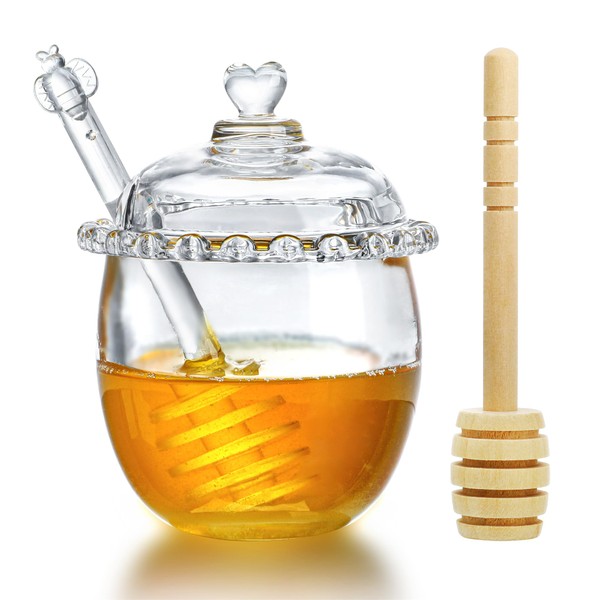 - 🍯Stylish Design: The sleek glass design adds a touch of elegance to your kitchen or dining table, making it a beautiful addition to any setting.The wide mouth design allows the honey spoon to easily capture honey in its grooves and twirl it without dribbling down.