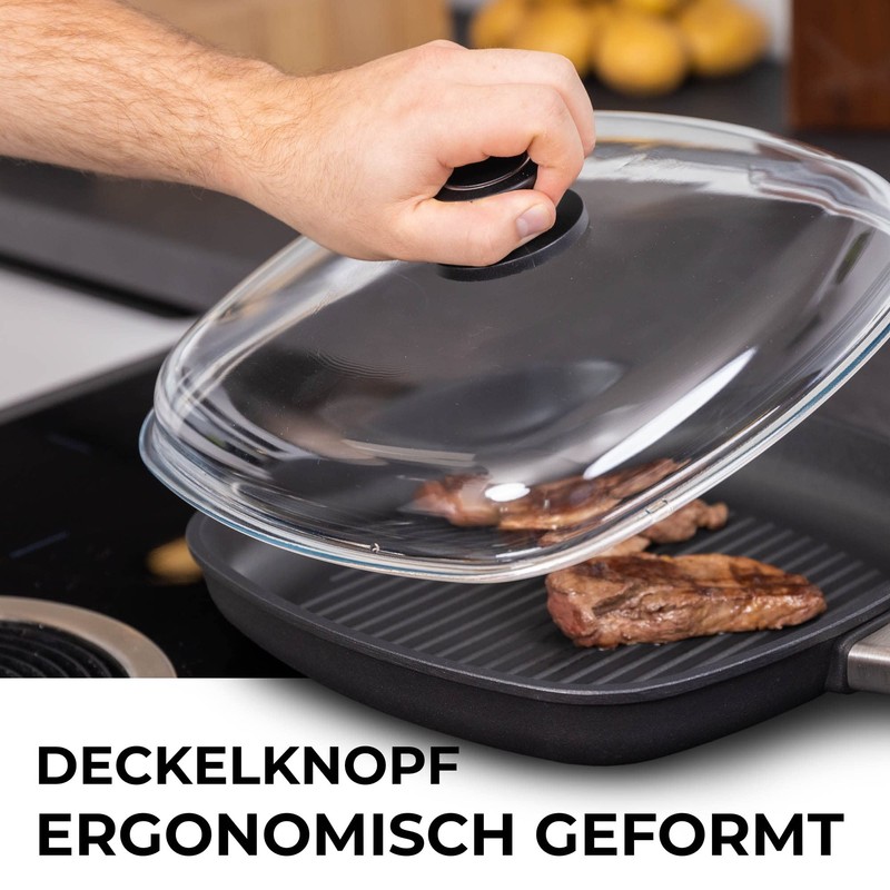 This oven-safe glass lid fits all small round pans and pots from any manufacturer with a diameter of 18 cm. All pan lids are made of hardened special glass. Of course, the glass lids for pans and pots are dishwasher safe.