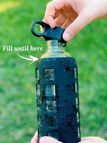 The maximum level of water that you should fill in your bottle is until the top of the silicone sleeve only before sealing the cap