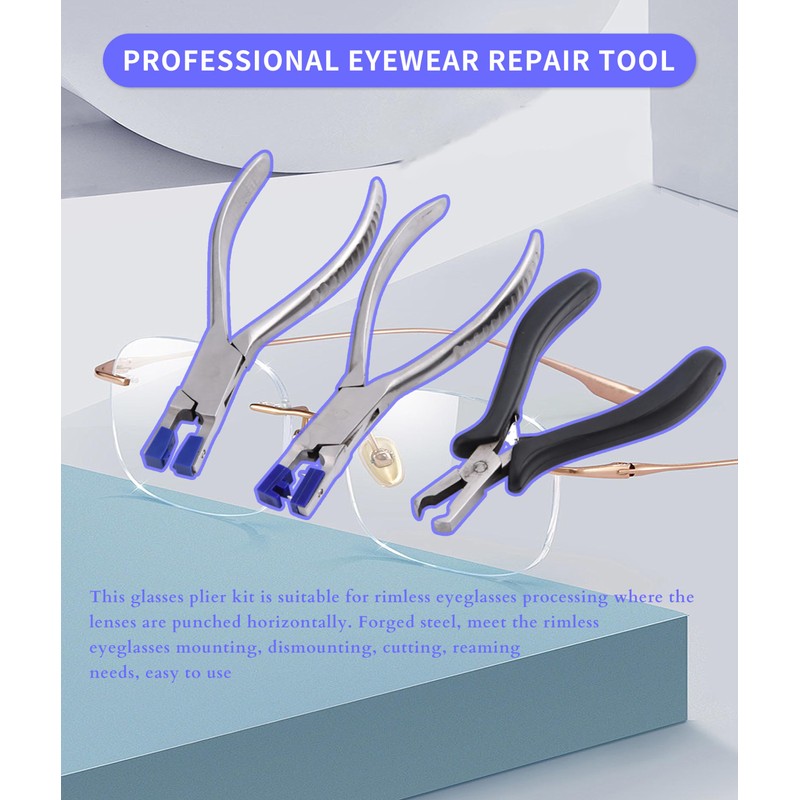 - APPLICATION: This glasses plier kit is suitable for rimless eyeglasses processing where the lenses are punched horizontally. Forged steel, meet the rimless eyeglasses mounting, dismounting, cutting, reaming needs, easy to use