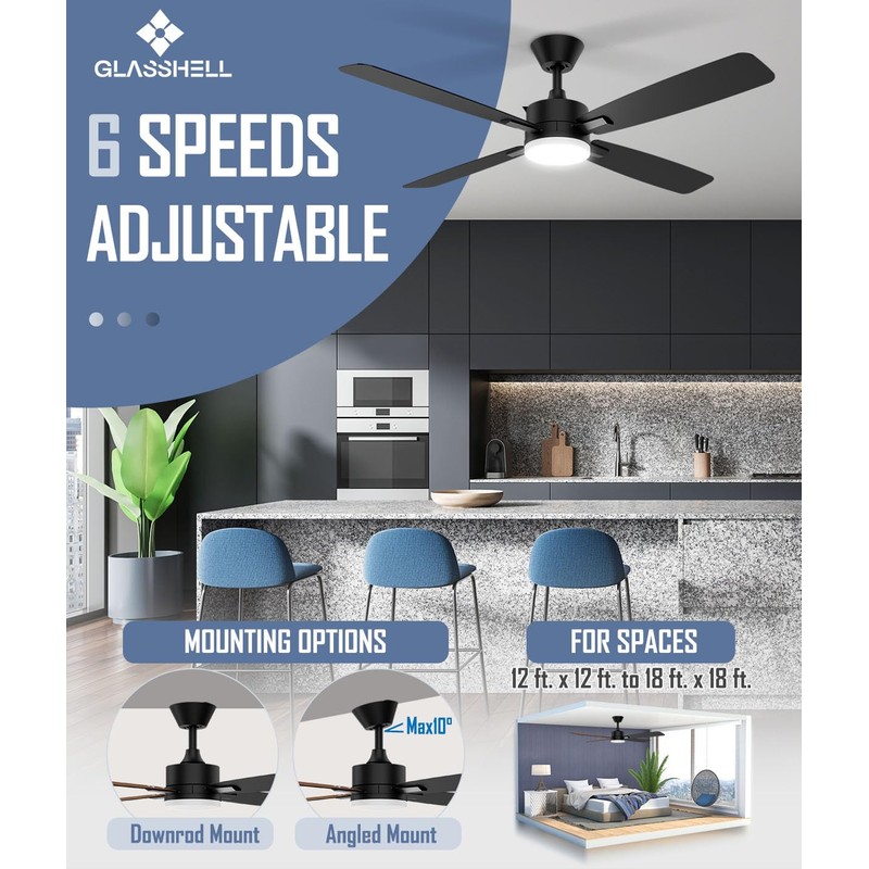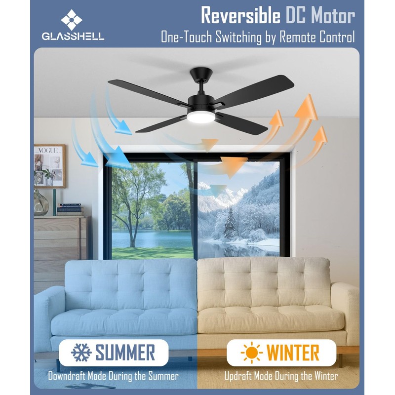 Glasshell Ceiling Fan 52 Inch, Remote Control Reversible DC Motors, 3CCT Dimmable Timer Noiseless, Ceiling Fan with Light for Bedroom Living Room, Indoor&Outdoor Black