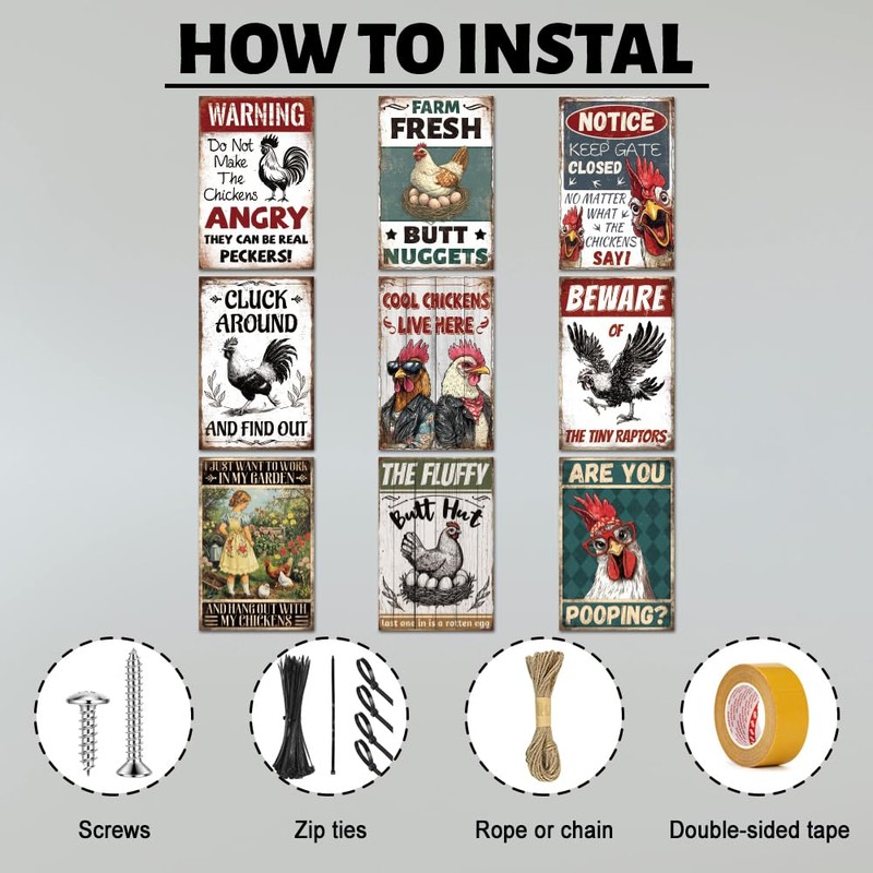- METAL CHICKEN SIGN DECORATION: 9 chicken coop signs measuring 8" x 12"(20x30cm), medium size, bright, vivid and easy to understand, the chicken sign adds a unique style to your decor.