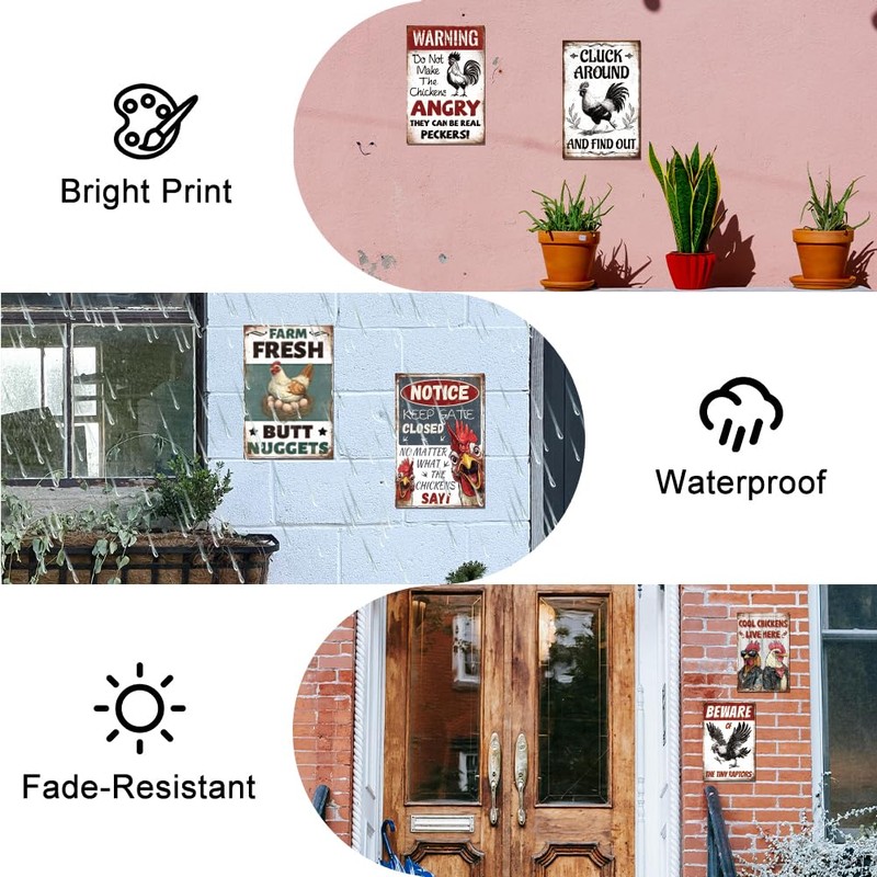 - PREMIUM QUALITY: Our chicken signs are made of high quality metal meterial, waterproof, UV resistant and durable. Printed with vibrant colors and crisp details, they will not fade in sunlight, rain or other extreme weather.