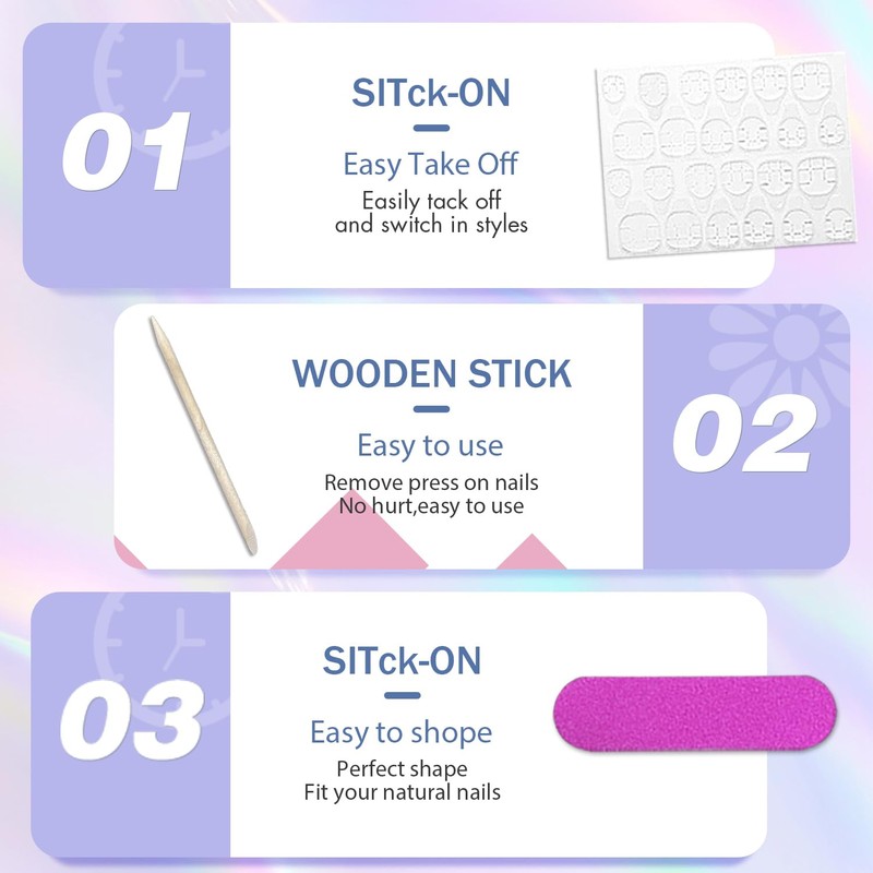 2.Please note that the nail glue is not included.If you want it last for a longer time,please use nail glue instead of the nail stickers.
