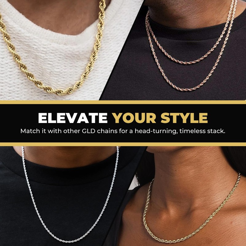 - Statement Jewelry for Every Style: From subtle to bold, GLD has the perfect gold rope chain for women leveling up their style game. Our chains are available in Yellow, White, and Rose Gold, and are designed to layer up or stand solo. With a full range of thicknesses and lengths, your next flex is locked in. And so is the perfect gift. Whether it's an anniversary, birthday, holiday, or just because, this is a statement everyone wears on repeat.