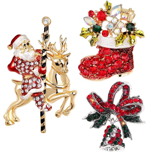 Gleamart 3Pcs Christmas Enamel Brooch Pin Set Elk Santa Claus Bell Xmas Boot Pin Gift