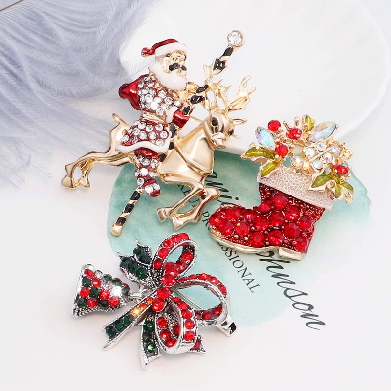 - Size: Cute christmas pins brooch's size as picture shows. Easy to put on and take off. Christmas pin set consists of elk santa claus, bell and Christmas boot.