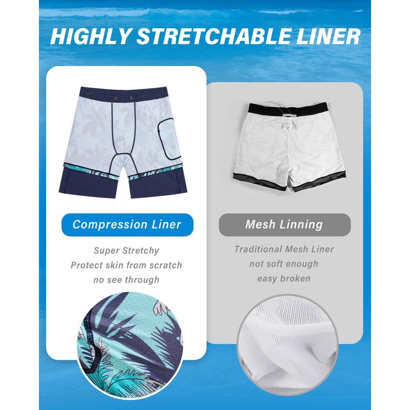 - 2In1 Mens Bathing Suits: The men bathing suits with compression lined protect your skin from scratch and keeps you flexible and comfortable, the compression liner likes the comfort of your second skin, as you swimming or work out in men's swimming trunks. These men's bathing suits liner ensures snug fitting while helping improve mobility.