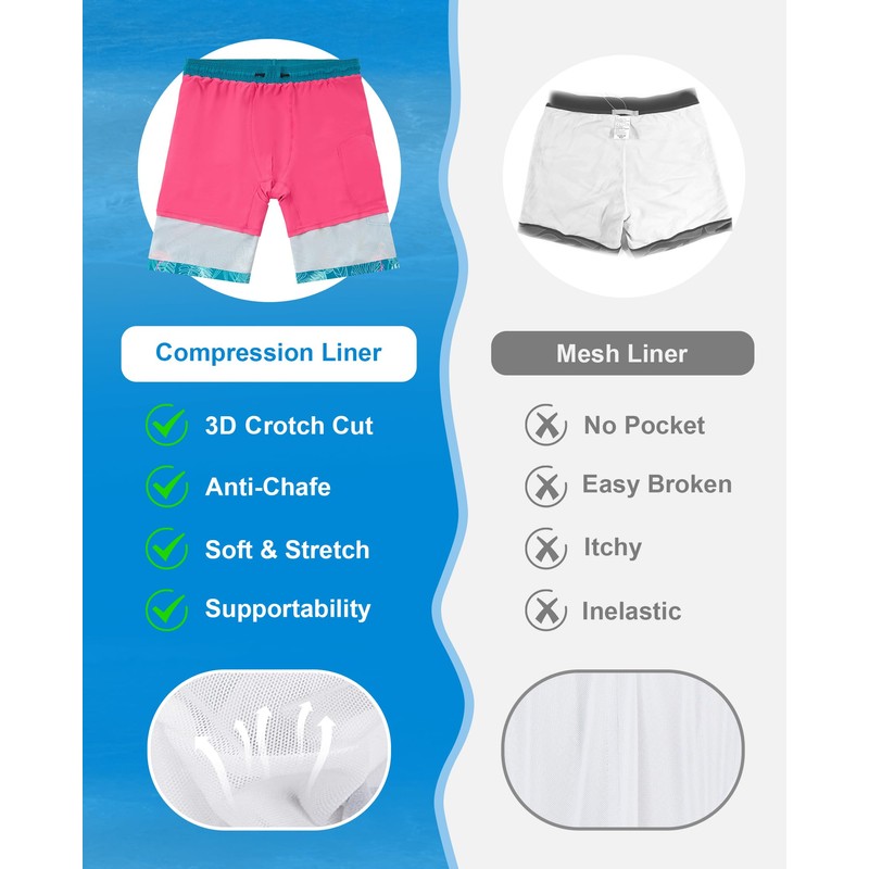 - 【2 in 1 Compression Liner】The Men's Board Shorts with compression brief liner is soft and comfortable, silky, smooth, soft and breathable mesh lining which is lightweight and comfortable. Important is can protect your skin and helps prevent chafing during water activities. You won't feel tight with mens swim shorts. Prevents itching caused by sand,double layer no mesh prevents the outer fabric from rubbing against the skin and it likes the comfort of your second skin.