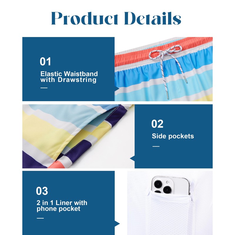 - 【Beach Shorts with Pockets】The mens bathing suit is designed with 2 side invisible pockets + 1 back pocket + 1 liner hidden pocket. Side pockets can store easy-to-fall items, such as cards or keys. The multi-pocket design makes it easy to carry more holiday items.
