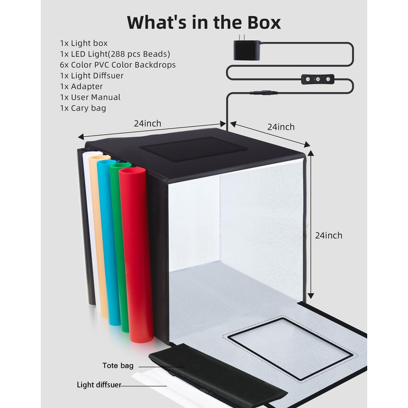 - 【Large 24x24 inch Light Box】 Light box is 24 inches in size, making it perfect for shooting objects of different sizes. Whether you're photographing jewelry, shoes, bags, toys, gifts, crafts, or other products, our light box is large enough to handle your needs.