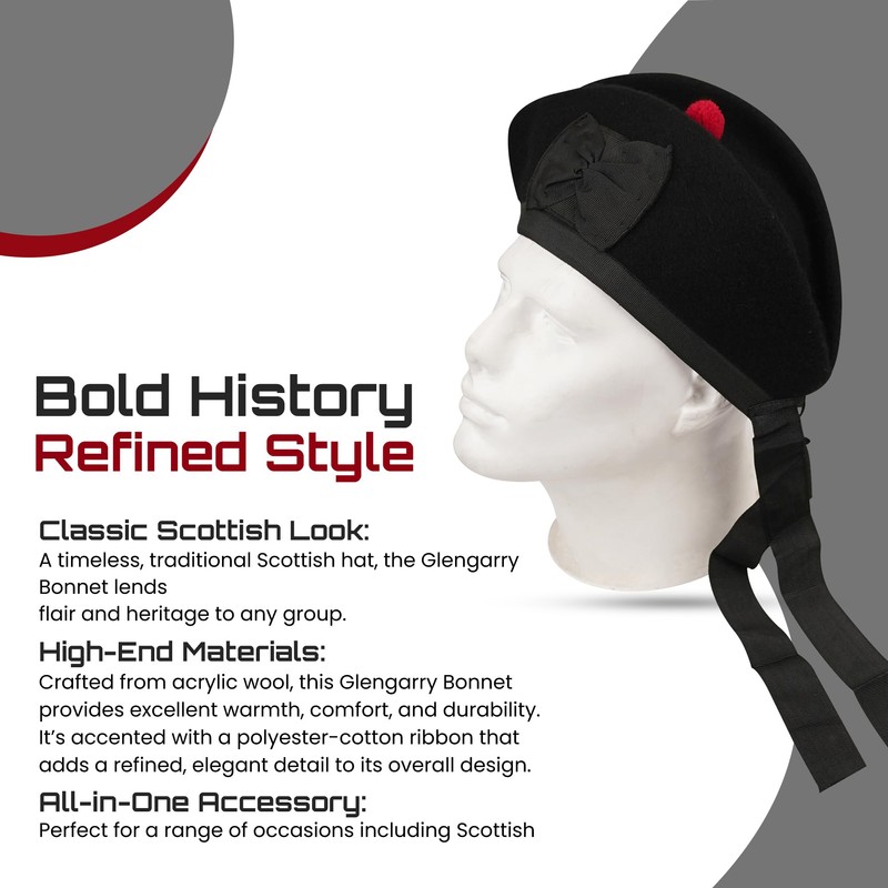 Includes a side bow with buckram support, allowing you to attach feathers, clan badges, or brooches for personalization. Perfect for formal events, pipe bands, or reenactments.