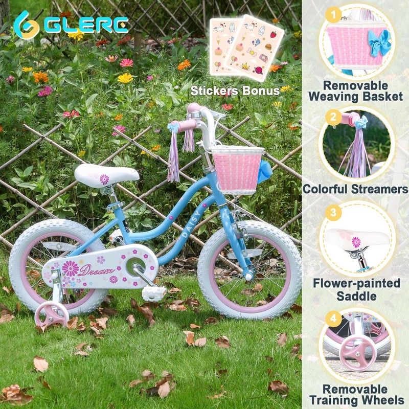 Glerc Daisy 12 Inch Girls Bike Ages 1 2 3 4 Years Old Kids Bicycle Princess Style with Training Wheels & Basket & Streamers & Bell for Birthday, Blue