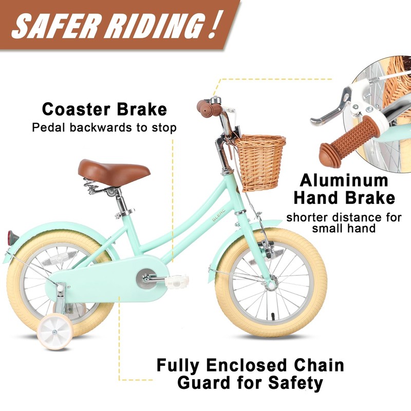 Glerc Little Molly 14 inch Kids Retro Cruiser Bike Bicycle for Girls Boys Ages 2 3 4 5 6 7 Year Old with Wicker Basket & Lightweight & Traning Wheels & Bell for Birthday Gift Mint Green