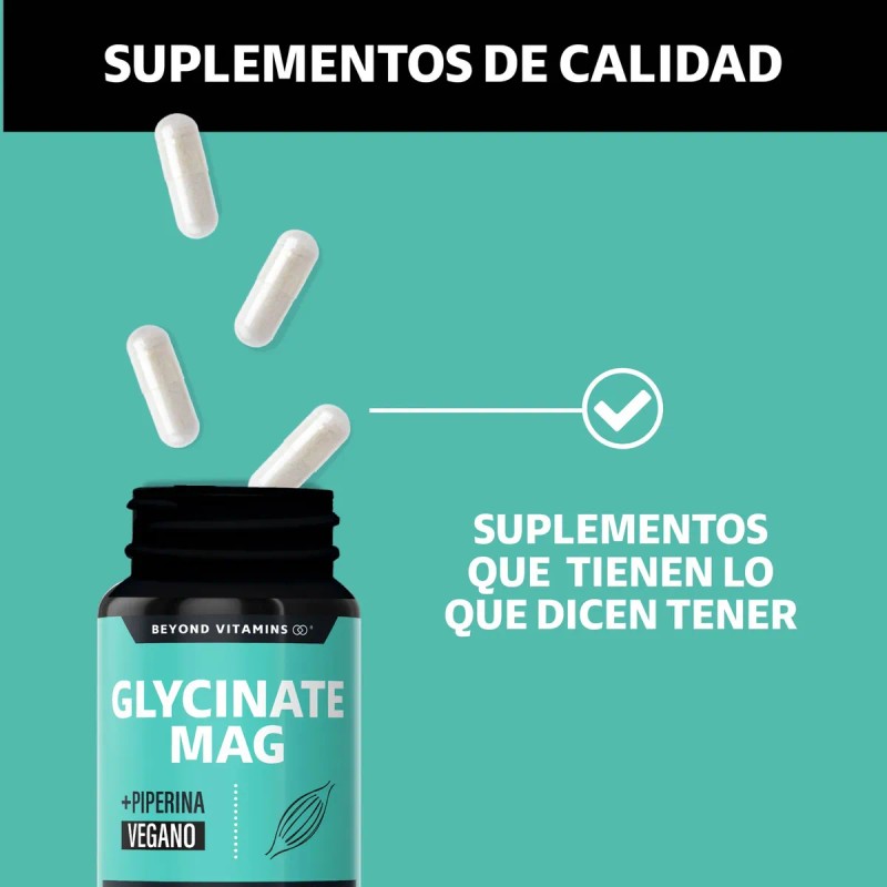 - +60 Cápsulas Glycinate Mag Beyond Vitamins contiene una combinación completa de Glicinato de Magnesio, Magnesio y Pimienta Negra estandarizada al 95%. Características del Glycinate Mag Beyond Vitamins: Libre de azúcares, lácteos y soya Libre de edulcorantes, colorantes, saborizantes, ingredientes artificiales ni conservantes No contiene hormonas No contiene antibióticos MODO DE EMPLEO Tomar cuatro (4) cápsulas al día, preferiblemente junto con alimentos (idealmente con grasas saludables, tales como aguacate, nueces, semillas o aceites de oliva o vegetales) y agua. No exceder la porción recomendada. PRECAUCIONES: No se recomienda su uso en menores de 18 años, Manténgase fuera del alcance de los niños. Conservar en un lugar fresco y seco. No consumir si el sello ha sido violado. Consumir antes de la fecha de expiración. El consumo de este producto es responsabilidad de quién lo recomienda y de quién lo usa. RESTRICCIONES DE USO: No se recomienda el uso de este producto durante el embarazo y lactancia. Si se encuentra bajo tratamiento médico, presenta una condición médica o se encuentra próximo a un procedimiento quirúrgico, consultar un especialista antes de su consumo. En caso de generar alergia a algunos de sus componentes, suspenda su uso. Aviso legal