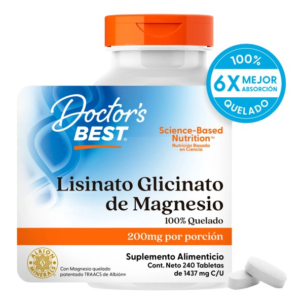 +Contiene 240 tabletas de Magnesio Lisinato Glicinato 100% Quelado (200mg por tableta).