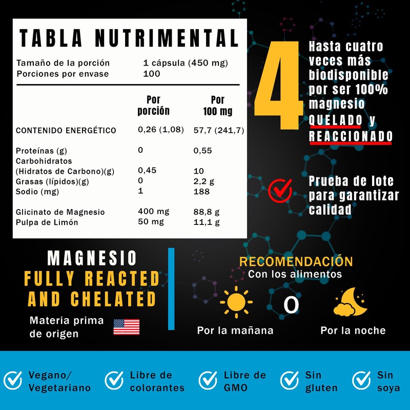 - 🧪 BASADO EN CIENCIA E INVESTIGACIÓN CIENTÍFICA: La Dra. Friné Velázquez formuló un glicinato de magnesio con uso exclusivo de cápsula vegetal y en sinergia estratégica con la pulpa de limón, lo que mejora la biodisponibilidad, la absorción y asimilación del magnesio en nuestro cuerpo
