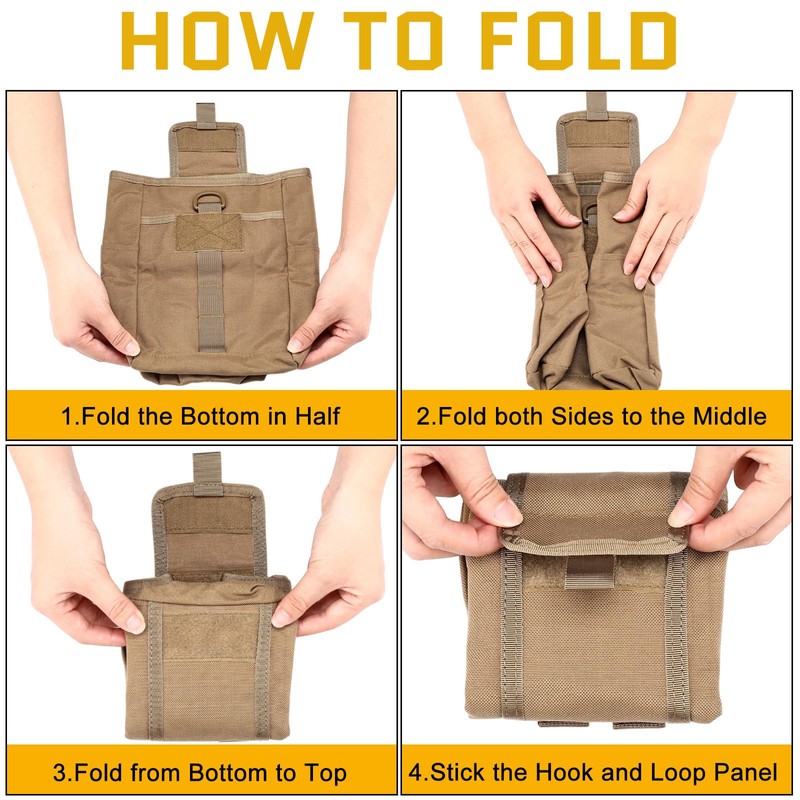 - Foldable and Compact Design: the dump pouch for belt is a portable size when it is deployed and folds up; It can be attached to any molle webbing vest; The dump pouch hook and loop clasp makes it easy to fold up and put out of the way when not in use, making it portable and handy