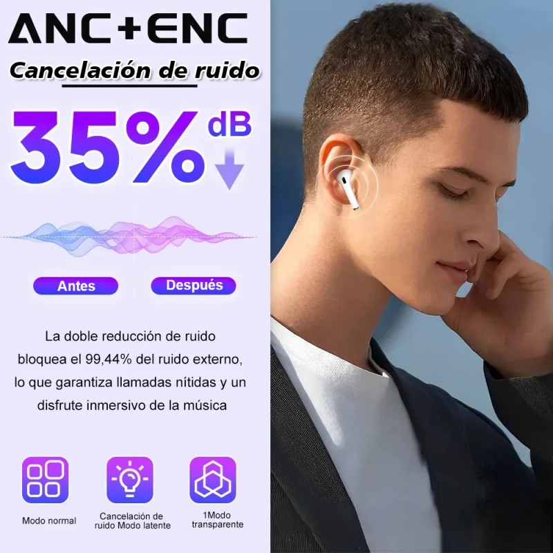 3. Cancelación de ruido adaptativa de 45dB: Elimina el ruido ambiental con un solo clic o activa el modo transparente para interactuar con tu entorno.