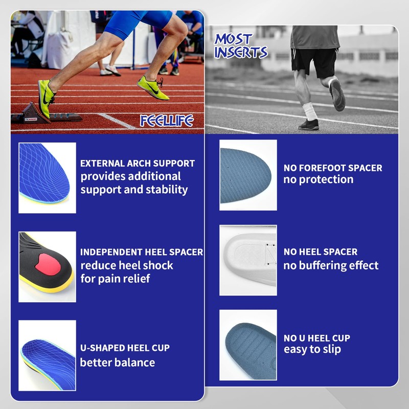 • Strong Arch Support: our plantar fasciitis insoles prevent excessive pronation or supination by supporting the subtalar joint; Extra high arch support and deep heel cup structure provide cushioning, keep foot bones vertical and balanced, provide stability