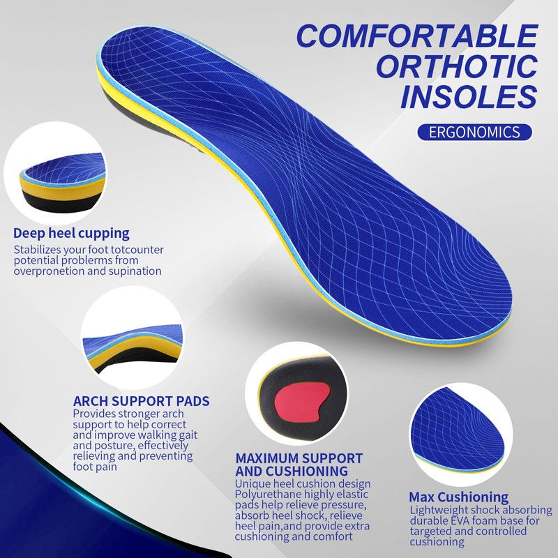 • Relieves and Prevents Foot Pain: orthotics provide firm arch support and reduce overstretching associated with plantar fasciitis; Helps relieve pressure and pain associated with flat feet, fallen arches, bunions, low back pain, and diabetes