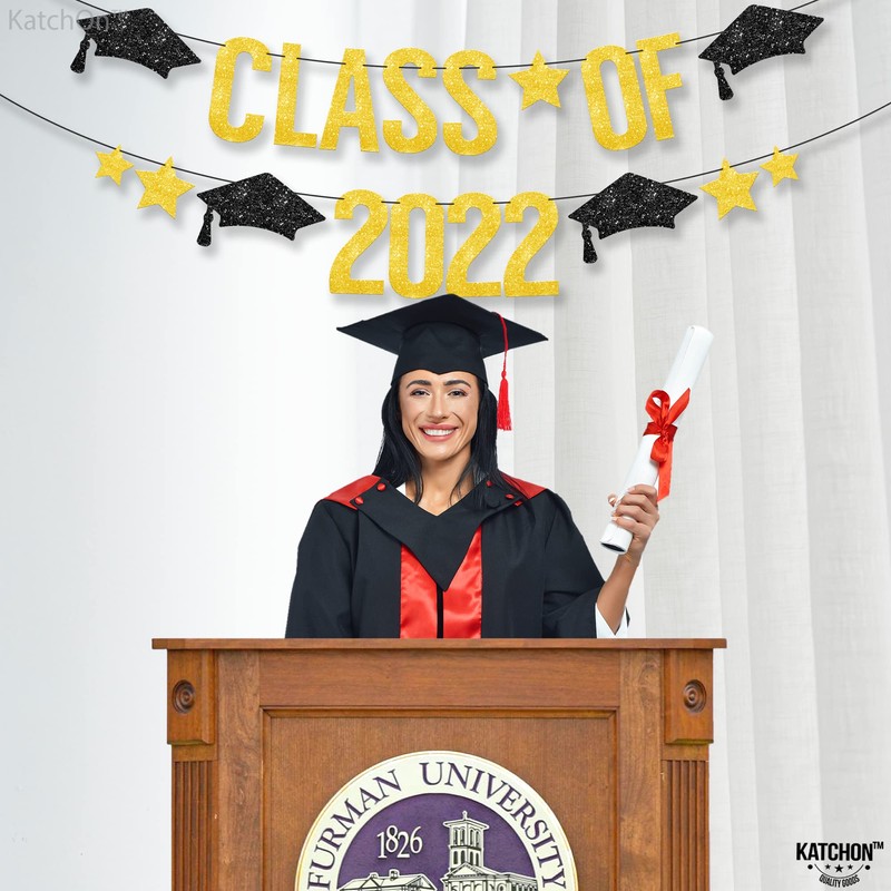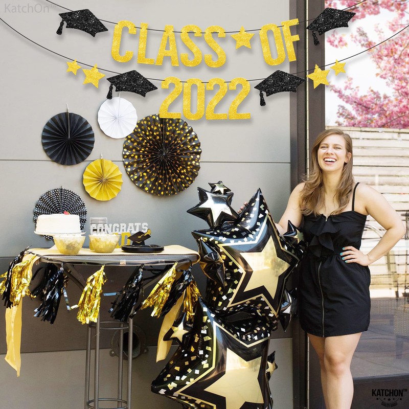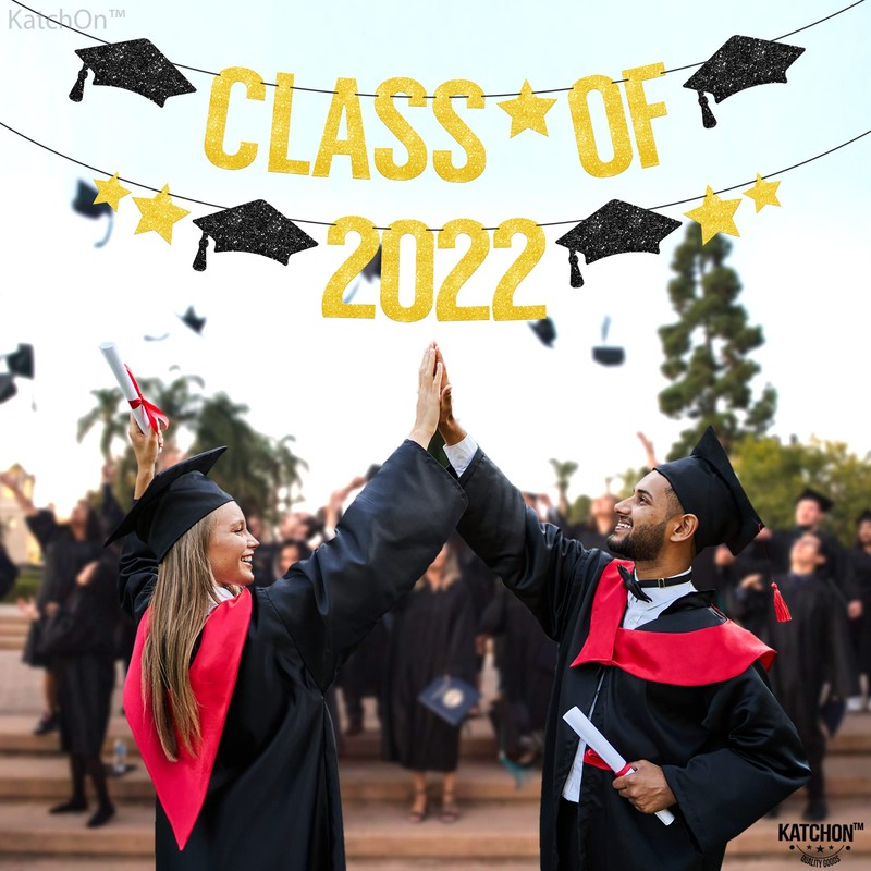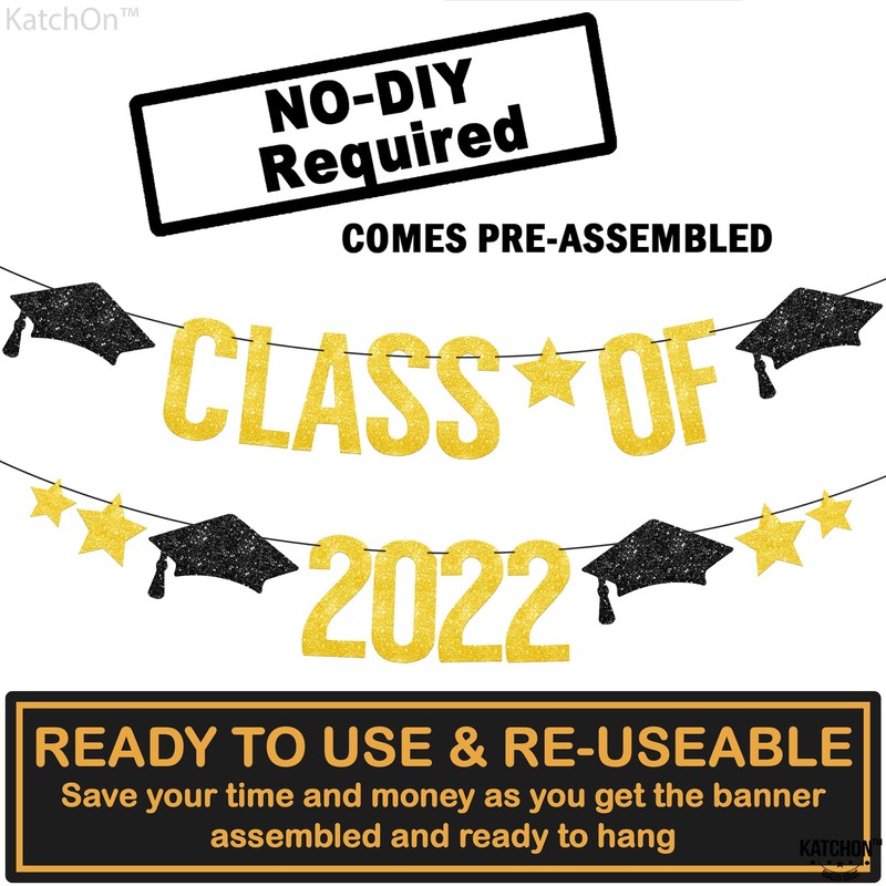 - LARGE SIZE : 10 FEET | BEAUTIFUL REAL GLITTER GRADUATION BANNER - Looking for a luxurious Decorations? These Graduation Decorations 2022 black and gold has got all that you need with perfect size of 10 feet, available in 2 pieces of pre assembled Class of 2022 Banner Gold with Graduation Cap that will surely wow everyone.