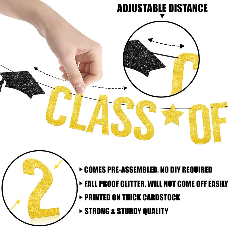 - BUY WITH CONFIDENCE | STUNNING DESIGN – Don't have doubt with these sturdy Grade A quality Glitter banner in graduation 2022 Gold banner if you are not satisfied with the quality we will provide full refund no questions asked These Graduation Hanging Decorations Banner is Preassembled in black and gold graduation party supplies 2022