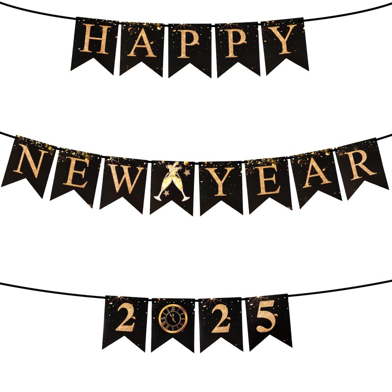 - Package Includes: You will receive 17 pieces of card paper and 1 roll of rope. The "Happy New Year 2025" banner is divided into 3 banners, a "Happy" banner, a "New Year" banner, and a "2025" banner.